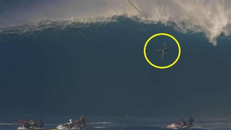 تمكّن أحد راكبي الأمواج من البقاء على قيد الحياة بعد أن قفز وسط موجة كبيرة على علو 12 متراً.