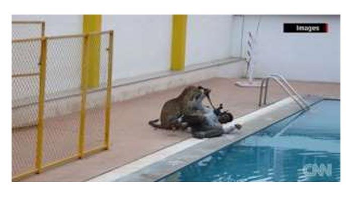 والتقطت كاميرات المراقبة مهاجمة الفهد لرجل بالقرب من بركة للسباحة.