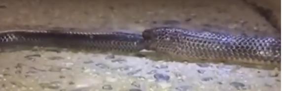 وأظهر مقطع الفيديو الأفعى وهي تطبق فكيها على جسد الأفعى الأخرى وتلتهمها شيئاً فشيئاً، قبل أن يقوم صائد الأفاعي بالإمساك بها.
