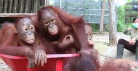 ويصطحب مسؤولو منظمة إنقاذ الحيوانات الدولية في المقاطعة القرود الصغيرة إلى المدرسة في عربة اليد إلى ما تسمى مدارس الغابات، وهي أماكن مختارة في غابات بورنيو تتعلم فيها القرود مهارات البحث عن الطعام وبناء بيوتها في الأشجار.