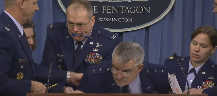 كانت كارولين جليسون، مساعدة المكتب الإعلامى للقوات الجوية الأمريكية تقف بجواره وواصلت الحديث بدلا منه وهى تمسك به حتى لا يسقط أرضا.