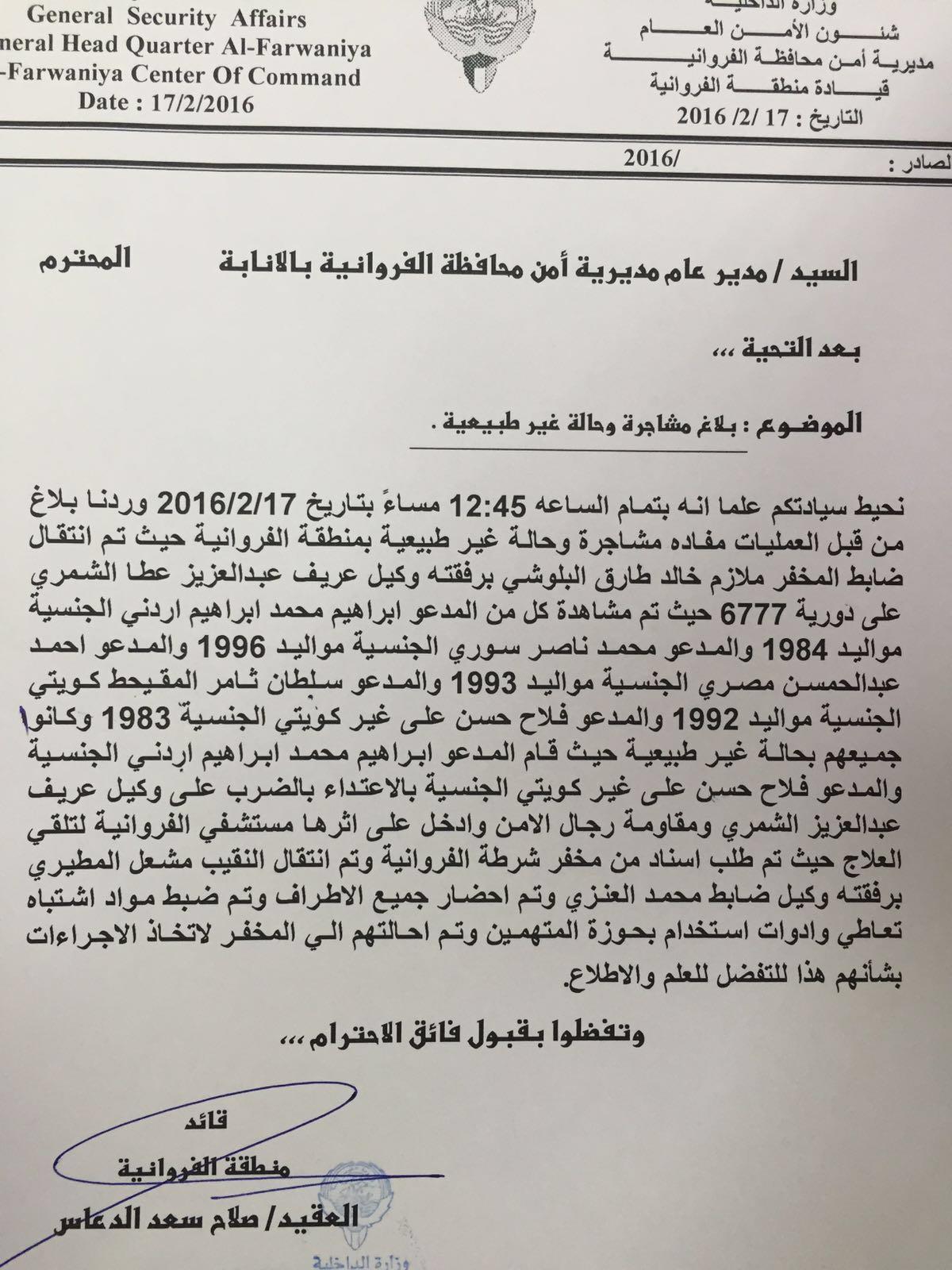وقد ورد بلاغ إلى مخفر الفروانية ضد كل من المدعو إبراهيم محمد ابراهيم أردني الجنسية مواليد 1984 والمدعو محمد ناصر سوري الجنسية مواليد 1996 والمدعو أحمد عبدالمحسن مصري الجنسية مواليد 1993 والمدعو سلطان ثامر المقيحط كويتي الجنسية من مواليد 1992 والمدعو فلاح حسن علي غير كويتي الجنسية وكانوا تحت تأثير المواد المخدرة.