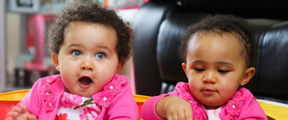 حينما تنام الطفلتان متجاورتين في سريرهما، تبدوان وكأنهما لا تربطهما صلة قرابة. لقد أخبرنا الأطباء أن فرصة إنجاب توأمين مختلفي الأعراق هي واحدة في المليون. يسعدنا أنهما متميزتان.