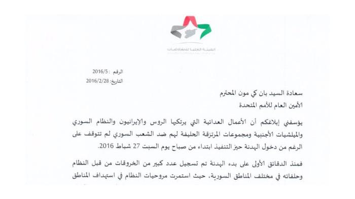 وأرسلت المعارضة شكوى إلى الأمين العام للأمم المتحدة بان كي مون بعدد من الانتهاكات التي وثقتها وأدانها وزير الخارجية السعودي عادل الجبير.