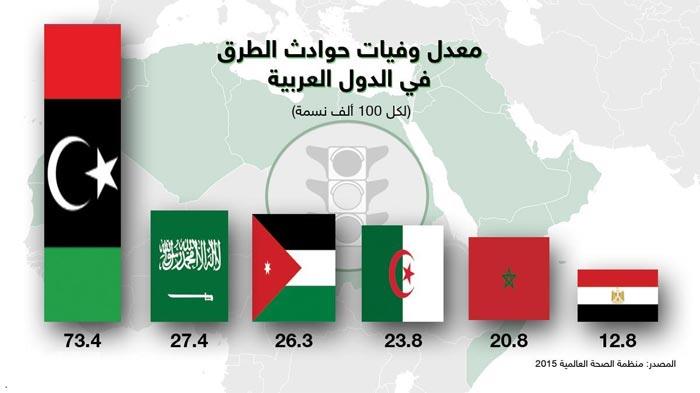 احتلت ليبيا والسعودية المركزين الأولين في معدل وفيات الحوادث المرورية في الدول العربية، بحسب التقرير السنوي الصادر عن منظمة الصحة العالمية للعام 2015. ووفقا للتقرير، فقد قتل في ليبيا 4398 بحوادث الطرق، بمعدل 73.4 حالة وفاة لكل 100 ألف نسمة، وهو ما يجعلها كذلك صاحبة أعلى معدل في العالم، وهو معدل لا يوجد مثيل له، أو حتى يقترب منه معدل آخر.