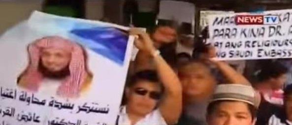 وأظهر تقرير مصور لقناة “جي ان ايه نيوز” الفلبينية المتظاهرين يحملون لوحات وصورًا كتبت بلغات عديدة انجليزية وعربية وفلبينية، تستنكر الاعتداء الذي وصفوه بالإجرامي، فيما حملت إحدى اللوحات عبارة “الشيخ الدكتور عائض القرني جاء إلى الفلبين للسلام”.