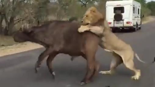 ويظهر في مقطع الفيديو هروب جاموستين على الطريق يتبعهما أسداً، إلا أن إحداهما لاذت بالفرار، أما الأخرى فتوجهت ناحية أسد الذي تراجع إلى الخلف، فظنت الجاموس أن الأمر انتهى، فانطلقت تلحق بالأخرى، إلا أن الأسد الجائع لم يتركها، وطاردها حتى انقض عليها، بصحبة آخر.