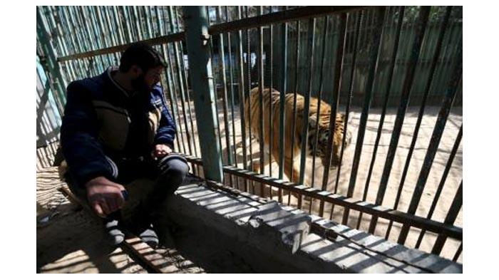 وقال عويضة (24 عاما) وهو يجلس قرب قفص نمر لم يأكل منذ أربعة أيام “أنا مضطر أبيعهم مشان (من أجل أن) أنقذهم.”