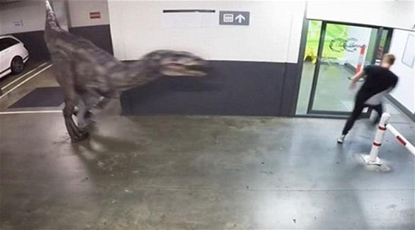 في دعابة مرعبة، قام شابان أستراليان بخداع زملائهما في العمل عبر استدراجهما إلى مرآب سيارات أسفل البناء وتخويفهم بديناصور مزيف.