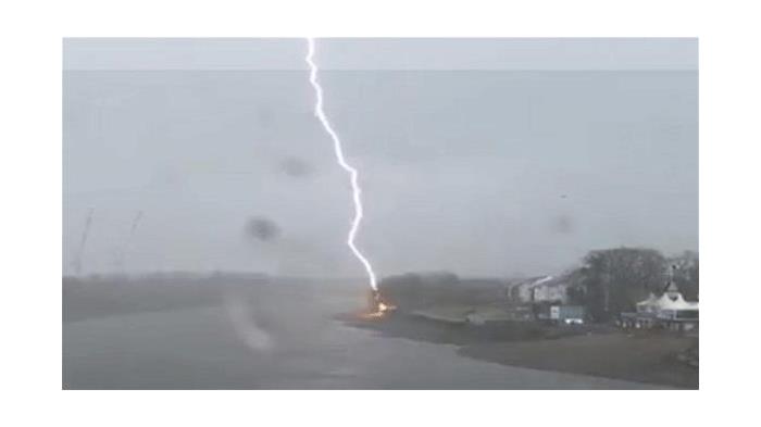 أظهر تسجيل مصور نشر على مواقع التواصل الاجتماعي صاعقة قوية وهي تضرب نهر التايمز البريطاني واحتراق شجرة على ضفته قبيل سباق سنوي للقوارب بين فريقي أكسفورد وكامبريدج.