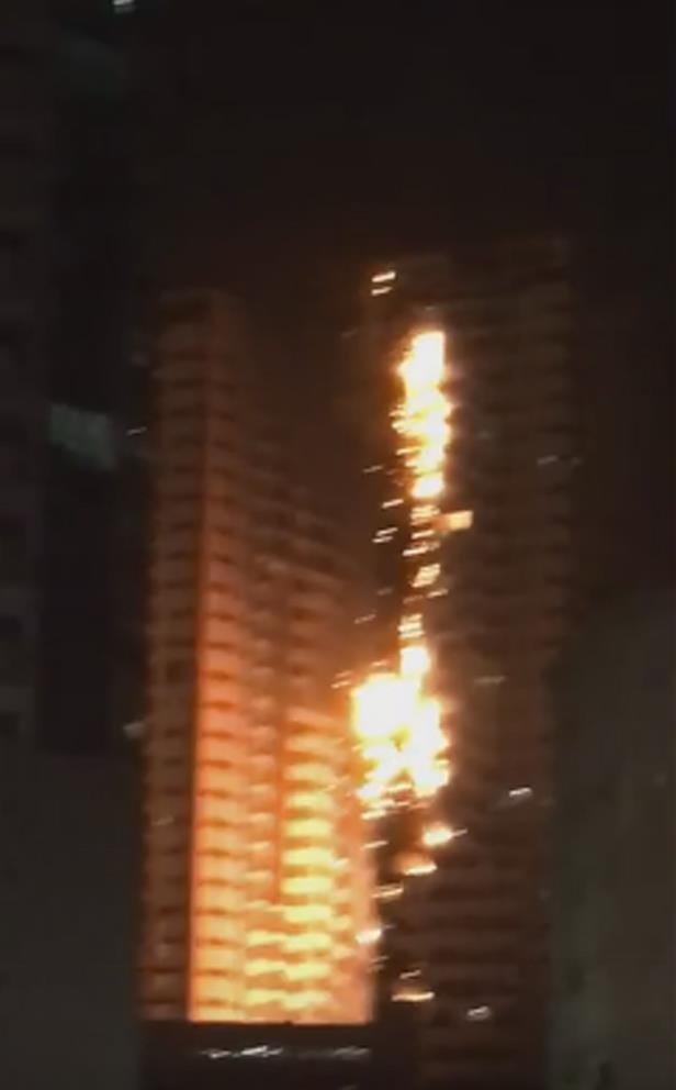 اندلع حريق هائل، اليوم الإثنين، ببرج سكني بإمارة عجمان بدولة الإمارات العربية المتحدة.