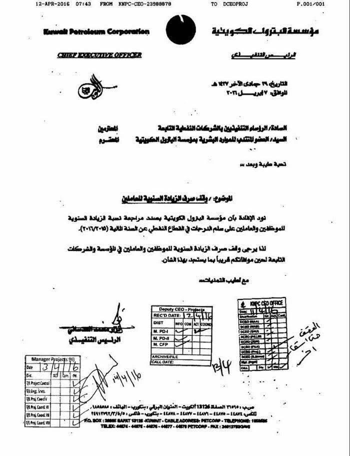 وقال المرزوق في تصريحات صحفية امس ان العدساني اصدر قرارا يوم 7 ابريل الماضي بوقف العلاوة السنوية للعاملين بالقطاع النفطي وظل القرار حبيسا في ادراجه الى ان عممه يوم 14 ابريل الماضي اي بعد 7 ايام من اصدار القرار الذي ينتقص بشكل سافر من حقوق ومكتسبات العاملين بالقطاع النفطي في البلاد .
