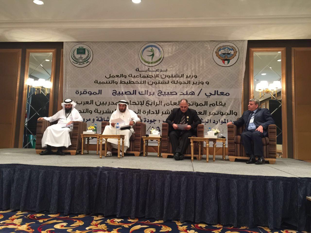 تحت رعاية معالي وزير الشئون الاجتماعية والعمل ووزير الدولة لشئون التخطيط والتنمية هند صبيح براك الصبيح وامين عام مجلس الوحدة الاقتصادية بجامعة الدول العربية سعادة السفير محمد الربيع والأمين العام للمؤتمر الاستاذ احمد البورسعيدي ورئيس اتحاد المدربين العام الدكتور يونس الخطايبة وعدد من اصحاب السلك الدبلوماسي والخبراء والمستشارين واساتذة الجامعة والمهتمين في المجال التدريب والتدريب المهني افتتح المؤتمر الرابع لاتحاد المدربين العرب والمؤتمر العربي العاشر لإدارة الموارد البشرية والتدريب بعنوان الموارد البشرية والتدريب جودة ومعايير .. رشاقة ومرونة ) في فندق الكوبثورن الجهراء ( سلسل الجهراء ) والذي يستمر ليوم غد 19 ابريل 2016.