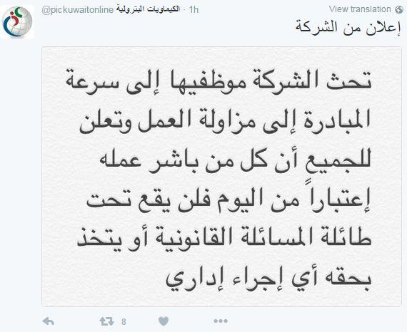 ومن جانبها قامت شركة الكيماويات البترولية بتوجيه رسالة عبر موفع التواصل الاجتماعي تويتر الخاص بها، تحث فيها العمال إلى العودة للعمل، واعدة اياهم بعدم المساءلة القانونية.