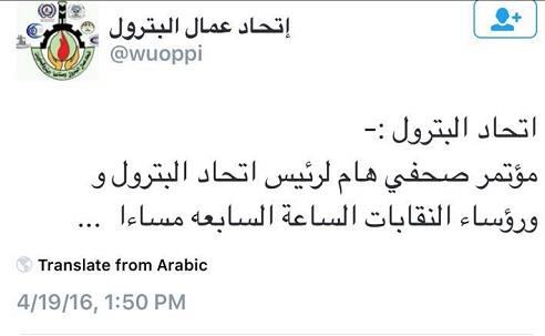 أعرب حساب اتحاد عمال البترول عبر حسابه في «تويتر» أن هناك مؤتمراً صحفياً لرئيس اتحاد البترول وروساء النقابات عند الساعة السابعة مساء اليوم.