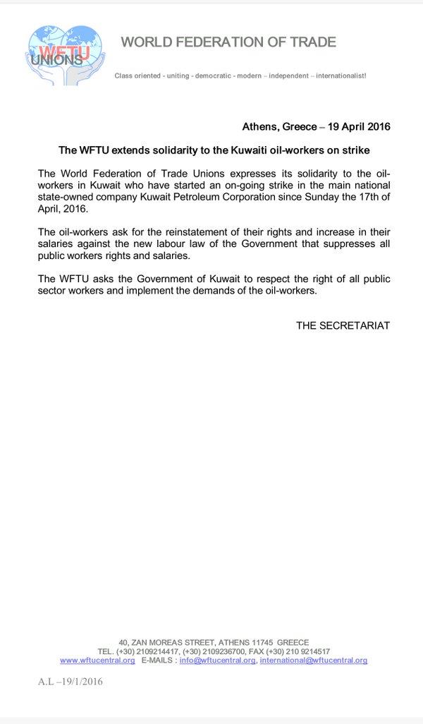 وقال عمال اتحاد البترول عبر حسابه الشخصي تويتر إن اتحاد النقابات العالمي أعلن دعمه اضراب القطاع النفطي المشروع.