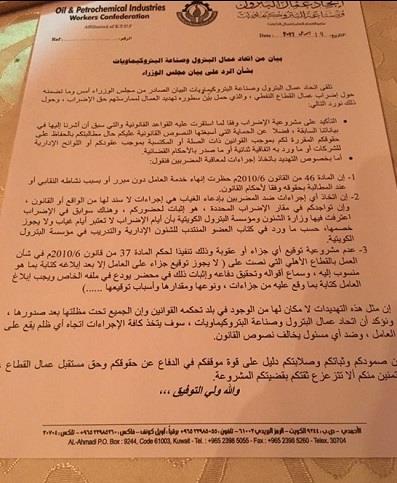 واشار البيان عدة نقاط منها "إن المادة 46 من القانون 6/2010م حظرت إنهاء خدمة العامل دون مبرر أو بسبب نشاطه النقابي أو عند المطالبة بحقوقه وفقا لأحكام القانون، كما إن اتخاذ أي إجراءات ضد المضربين بادعاء الغياب هي إجراءات لا سند لها من الواقع أو القانون، وإن تواجدكم في مقار الإضراب المحددة، هو إثبات لحضوركم، وهناك سوابق في الإضراب اعترفت فيها وزارة الشئون ومؤسسة البترول الكويتية بأن أيام الإضراب لا تعتبر أيام غياب ولا يجوز خصمها، حسب ما ورد في كتاب العضو المنتدب للشئون الإدارية والتدريب في مؤسسة البترول الكويتية.
