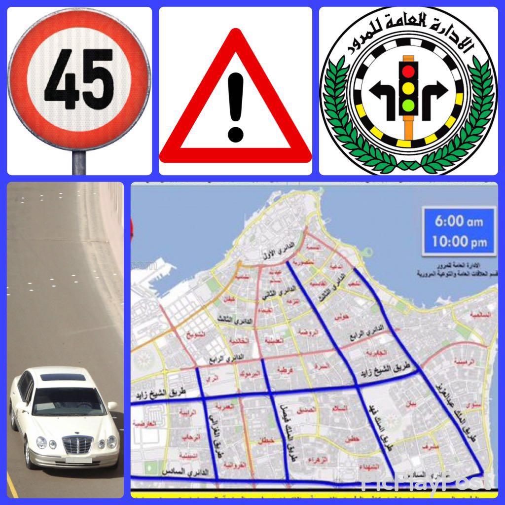 من الساعة (6:00 صباحاً وحتى الساعة 10:00 مساءاً) على أن لا تتجاوز سرعة المركبة عن 45 كم/س في الاتجاهين وتكون في الطرقات التالية: