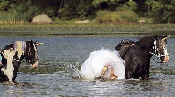 تحلم الكثير من النساء بحفل زفاف مستوحى من القصص الأسطورية، وهذا ما دفع امرأة أمريكية إلى محاولة التقاط صور لنفسها وهي تعبر النهر على حصان مرتدية ثوب الزفاف وفي كامل حلتها. لكن الأمور لم تجر كما خططت سو أنجيلينا من أكولاند بولاية نيوجرسي، حيث تعرضت لحادث مؤسف، وسقطت في الماء، مما تسبب بإتلاف تسريحتها وابتلت من رأسها إلى أخمص قدميها، بحسب صحيفة دايلي ميل البريطانية. وكانت سو تحلم بصور لا تنسى مع حصانها المفضل، لكن الحصان تحمس زيادة عن اللازم، وراح يعدو في الماء، مما أدى إلى سقوط العروس وإفساد جميع خططها. وكانت صديقة العروس ماكنزي فولغاريس شاهدة على الحادثة، حيث امتطت حصاناً آخر ورافقت العروس في جولتها، لكنها وجدت ما حدث مسلياً أكثر من صديقتها.