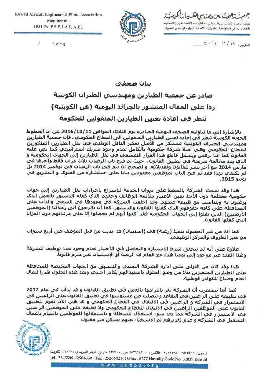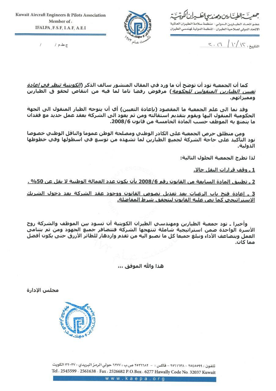 وشددت الجمعية على أن ما ورد في المقال المنشور سالف الذكر (الكويتية تنظر في إعادة تعيين الطيارين المنقولين للحكومة) مرفوض رفضا تاما لما فيه من انتقاص لحقوق الطيارين ومميزاتهم.
