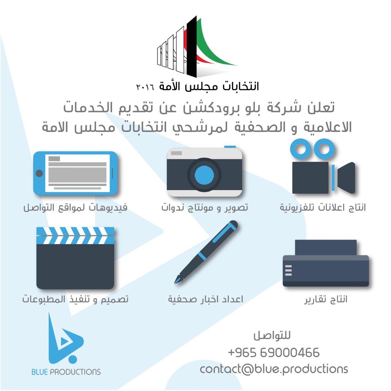 تعلن شركة بلو برودكشن عن تقديم الخدمات الإعلامية والصحفية لمرشحي انتخابات مجلس الأمة.