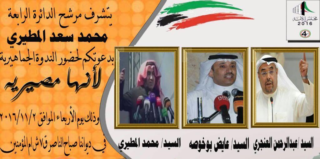يقيم مرشح الدائرة الرابعة محمد سعد المطيري اليوم الأربعاء 2016/11/2 ندوة جماهيرية.