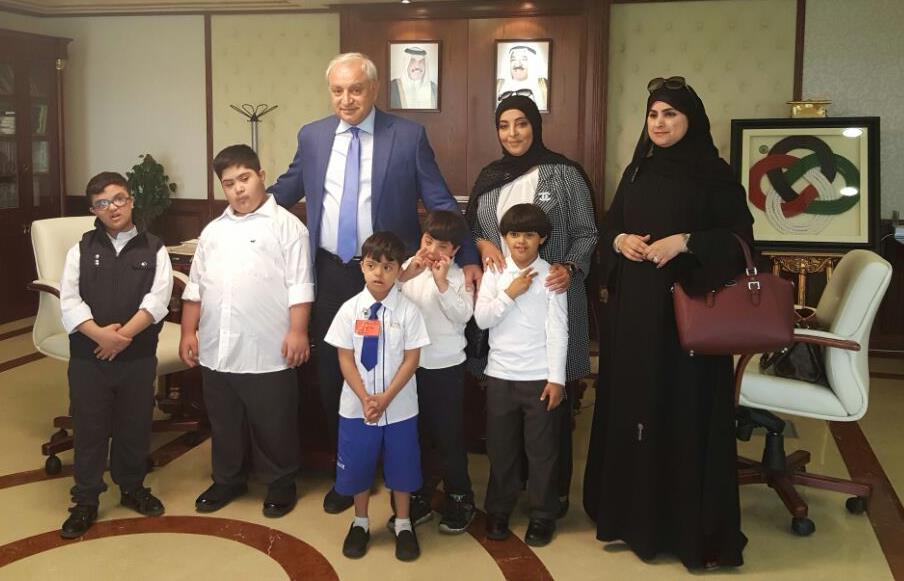 وزير التربية وزير التعليم العالي الكويتي الدكتور بدر العيسى خلال استقباله مجموعة من الاطفال المصابين بمتلازمة (داون)