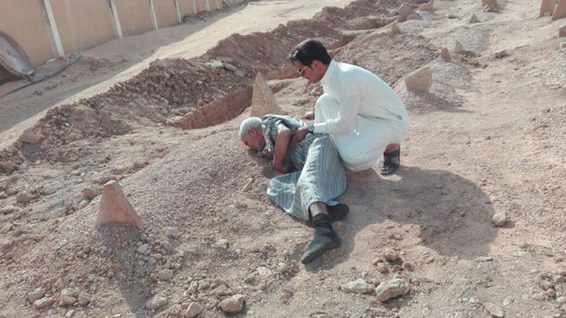 وتناقلت مواقع التواصل الاجتماعي صورة لسعودي سبعيني يقبل قبراً، يسنده حفيده في صورة من صور الوفاء بين رجل وزوجته.