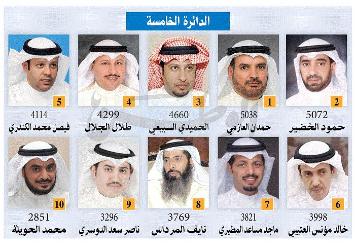 أسفرت نتائج الفرز لأصوات الناخبين بالدائرة الخامسة عن حصد حمدان العازمي المركز الأول في سباق المرشحين لعضوية مجلس الأمة 2016 حيث حصل على 5072 صوتاً تلاه في المركز الثاني حمود عبدالله الخضير حاصلاً على 5038 صوتاً، فيما جاء الحميدي بدر الحميدي السبيعي في المركز الثالث بحصوله على 4660 صوتاً، تلاه في المركز الرابع طلال سعد الجلال السهلي بواقع 4299 صوتاً.