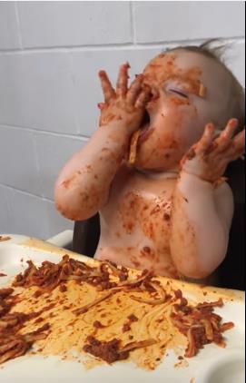 وبعد بضع ثوان من القيلولة، فاقت الطفلة لتعيد محاولاتها في التهام المزيد من السباجيتي، لكن تثاقل رأسها وسقطت بها لأسفل، ورغم قوة نعاسها، إلا أن طعم السباغيتي باللحمة والصلصلة لا يقاوم، فاستعادت قوتها وكفاحها واستيقظت وتمكنت من التهام قبضة ثم غطت في النوم مجدداً، إلى أن استفاقت استعداداً لأخذ حمام دافئ يزيل آثار السباغيتي الذي لطخت به جسمها كاملاً.