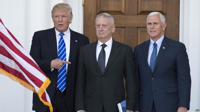 دونالد ترامب برفقة الجنرال المتقاعد جيمس ماتيس (وسط) ونائبه مايك بنس (يسار)
