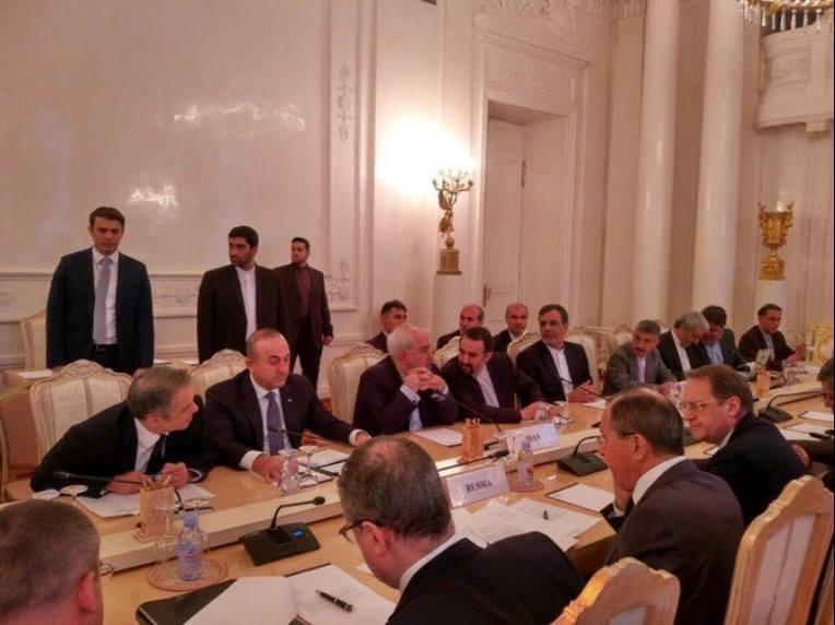 أظهرت صورة نشرتها وسائل إعلام رسمية إيرانية الثلاثاء، أحد أفراد الحماية الشخصية لوزير الخارجية الإيراني محمد جواد ظريف، وهو يراقب بحذر رجل الأمن الخاص بحراسة وحماية وزير خارجية تركيا مولود جاويش أوغلو، وذلك على هامش اجتماع ثلاثي تستضيفه موسكو بشأن الأزمة السورية.