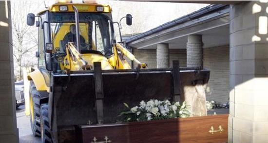 شيع جثمان عامل بناء سابق على حفار ضخم، وذلك تحقيقا أمنيته الأخيرة.