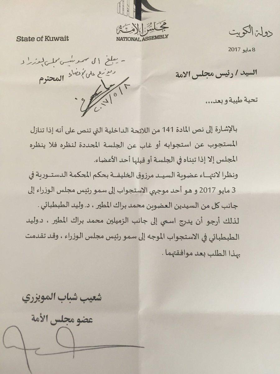 النائب المويزري تقدم بطلب الانضمام كطرف ثالث بدلا من النائب المبطلة عضويته مرزوق الخليفة ضمن مقدمي الاستجواب الأول الموجه إلى سمو رئيس مجلس الوزراء بصفته بعد موافقة النائبين الدكتور الطبطبائي والمطير.