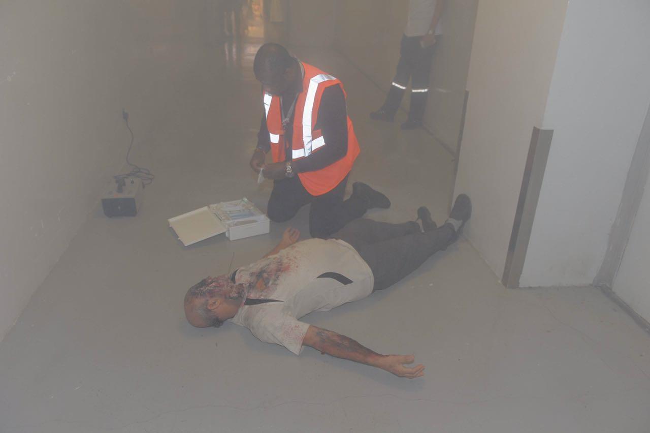 وبجانب آخر أشاد الدكتور / طارق الجسار بفنيي الطوارئ الطبية والقائمين على هذه عملية من هيئة طبية وإدارية وتمريضية ، وعملهم المميز بحادث الإخلاء الوهمي والدور الهام الذي يقومون به لخدمة بلدهم الكويت .