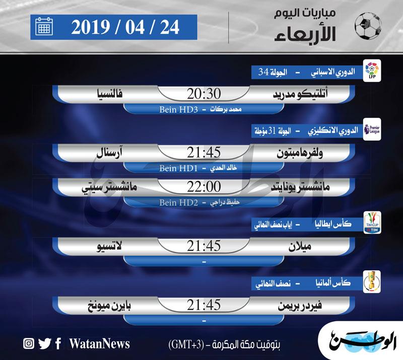 أبرز المباريات العالمية ليوم الأربعاء 24 أبريل 2019