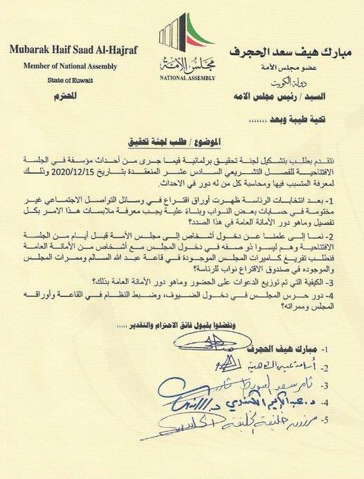 على خلفية الأحداث التي شهدتها الجلسة الافتتاحية لمجلس الأمة، والتي أثارت استياء واسعًا شعبيًا ونيابيًا، تقدم كل من النواب مبارك الحجرف ومرزوق الخليفة وأسامة الشاهين وعبدالكريم الكندري وثامر السويط بطلب تشكيل لجنة تحقيق برلمانية في «الأحداث المؤسفة» خلال الجلسة الافتتاحية للفصل التشريعي السادس عشر، والتي عقدت في 15 ديسمبر الجاري.