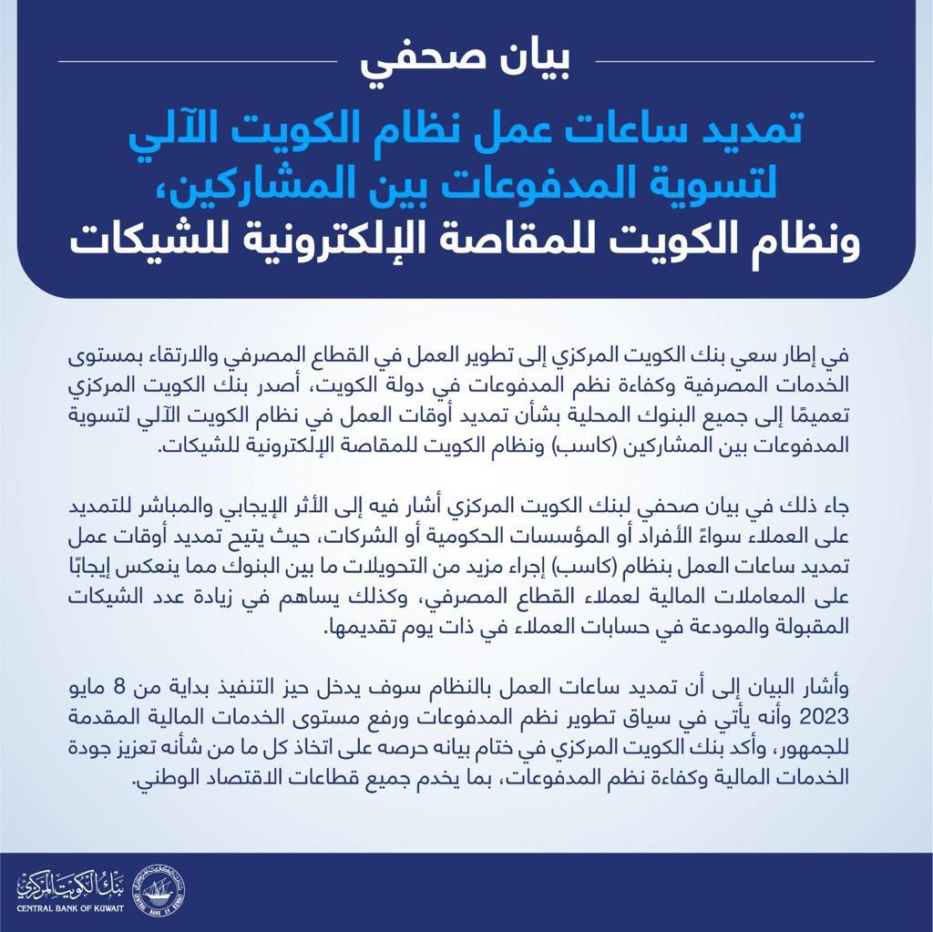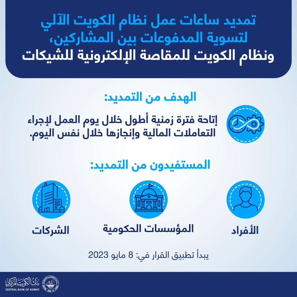 في إطار سعي بنك الكويت المركزي إلى تطوير العمل في القطاع المصرفي والارتقاء بمستوى الخدمات المصرفية وكفاءة نظم المدفوعات في دولة الكويت، أصدر بنك الكويت المركزي تعميمًا إلى جميع البنوك المحلية بشأن تمديد أوقات العمل في نظام الكويت الآلي لتسوية المدفوعات بين المشاركين (كاسب) ونظام الكويت للمقاصة الإلكترونية للشيكات.