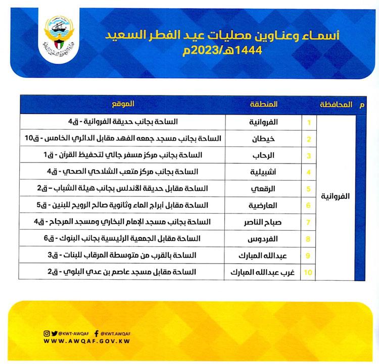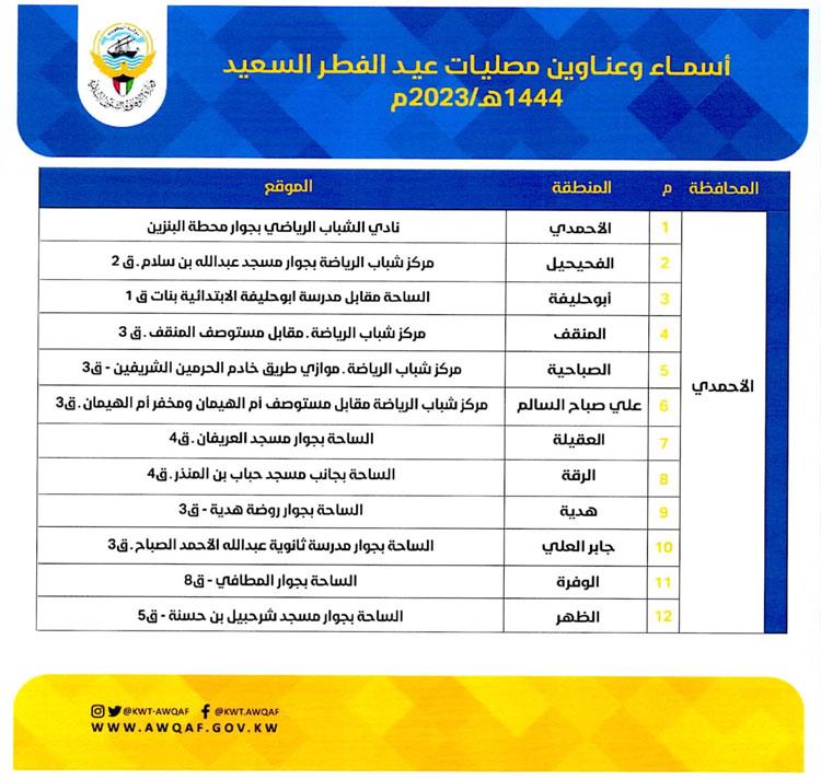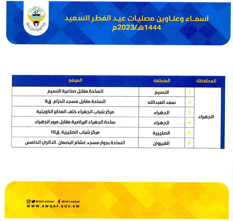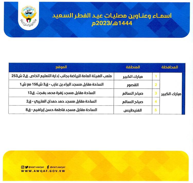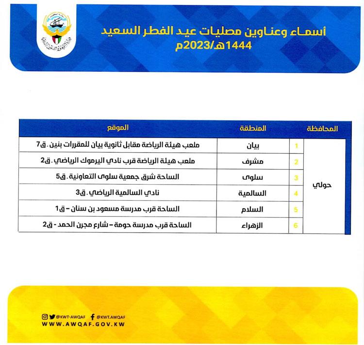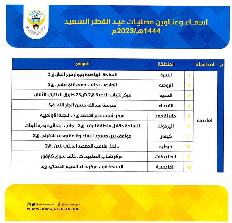 وتوزعت المصليات الـ 49 كالتالي: 10 في محافظة العاصمة، و 6 في محافظة حولي، و 10 في محافظة الفروانية، و 6 في محافظة الجهراء، و 5 في محافظة مبارك الكبير، و 12 في محافظة الأحمدي، علمًا بأن صلاة العيد ستقام في تمام الساعة 5:30 صباحًا.