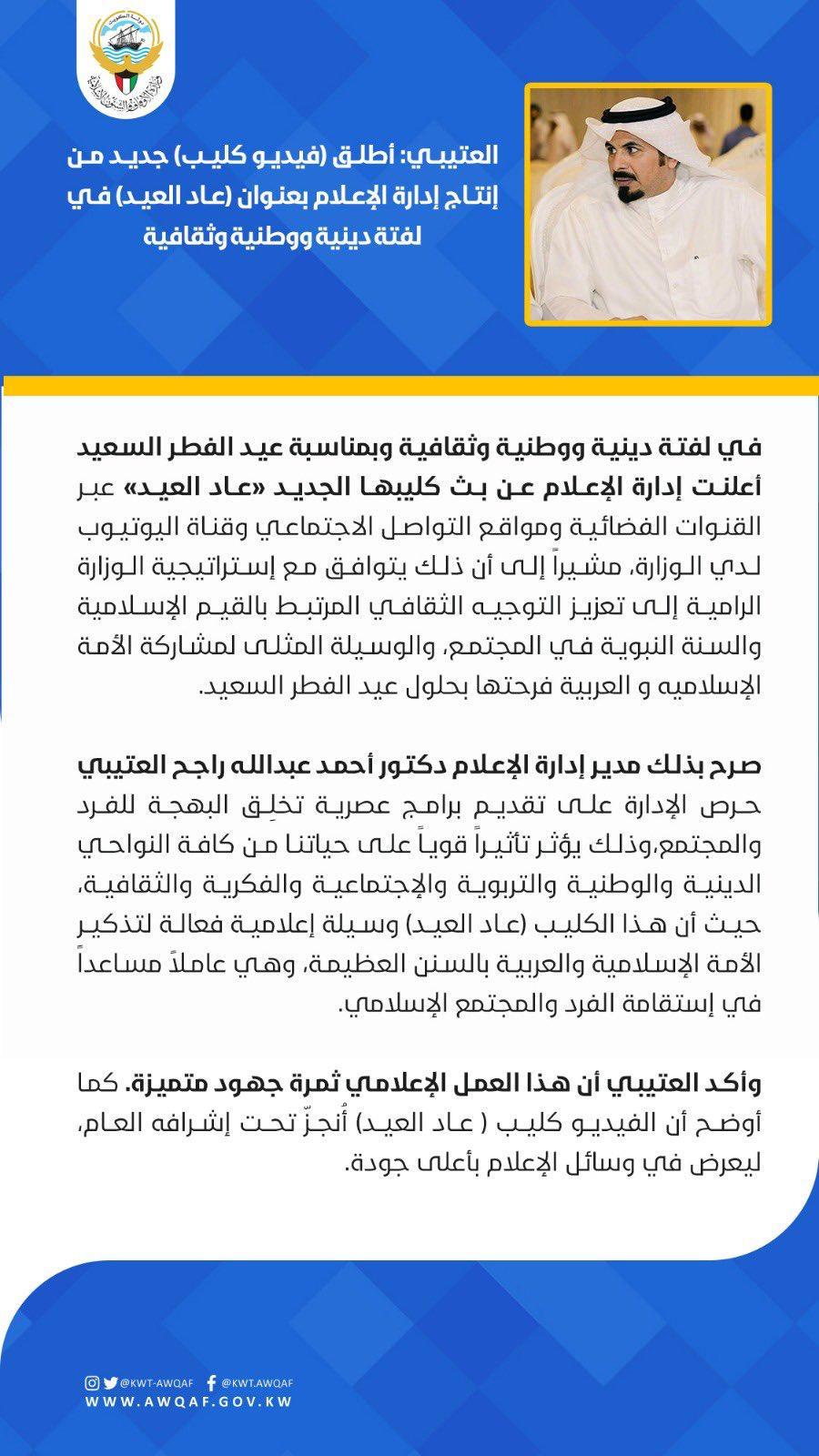 في لفتة دينية ووطنية وثقافية وبمناسبة عيد الفطر السعيد أعلنت إدارة الإعلام عن بث كليبها الجديد «عاد العيد» عبر القنوات الفضائية ومواقع التواصل الاجتماعي وقناة اليوتيوب لدى الوزارة. مشيرا إلى أن ذلك يتوافق مع إستراتيجية الوزارة الرامية إلى تعزيز التوجيه الثقافي المرتبط بالقيم الإسلامية والسنة النبوية في المجتمع. والوسيلة المثلى لمشاركة الأمة الإسلامية والعربية فرحتها بحلول عيد الفطر السعيد.
