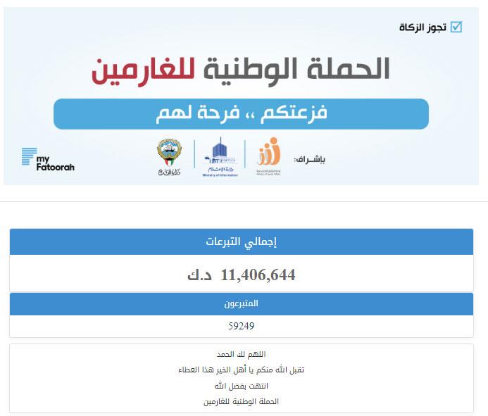 أعلنت وزيرة الشؤون الاجتماعية وشؤون المرأة والطفولة المهندسة مي البغلي أن حصيلة التبرعات للحملة الوطنية للغارمين (فزعتكم فرحة لهم) تجاوزت سقف الـ 11 مليون دينار ساهم بها أكثر من 59 ألف متبرع.