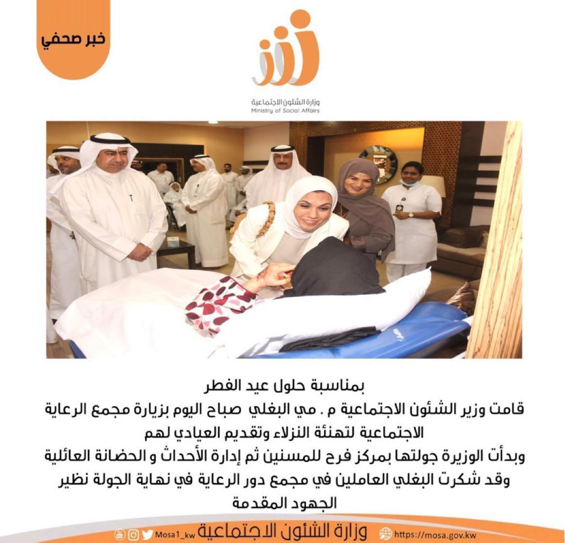 جاء ذلك في تصريح صحافي خلال زيارة قامت بها الوزيرة البغلي الى مجمع الرعاية الاجتماعية أمس الجمعة شملت مركز فرح للمسنين والحضانة العائلية والاحداث لتهنئة النزلاء وتقديم العيادي لهم.