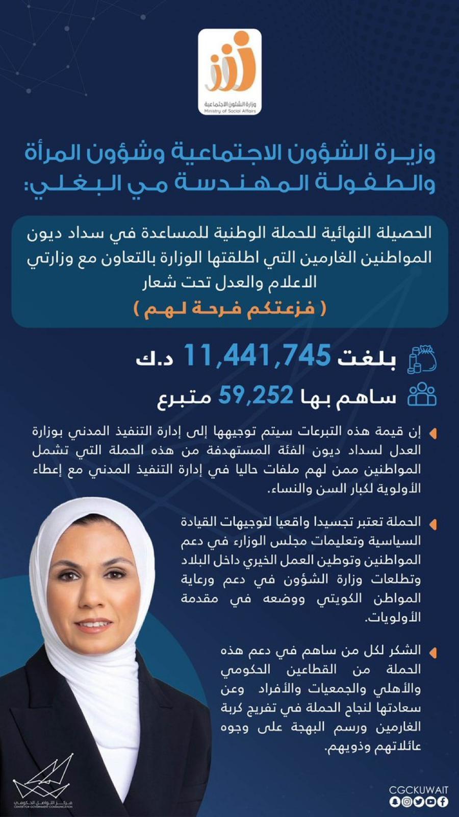 أعلنت وزيرة الشؤون الاجتماعية وشؤون المرأة والطفولة المهندسة مي البغلي مساء اليوم الخميس اختتام الحملة الوطنية للمساعدة في سداد ديون الغارمين المدنيين بإجمالي تبرعات بلغ 745ر441ر11 دينارا كويتيا (نحو 3ر37 مليون دولار أمريكي).