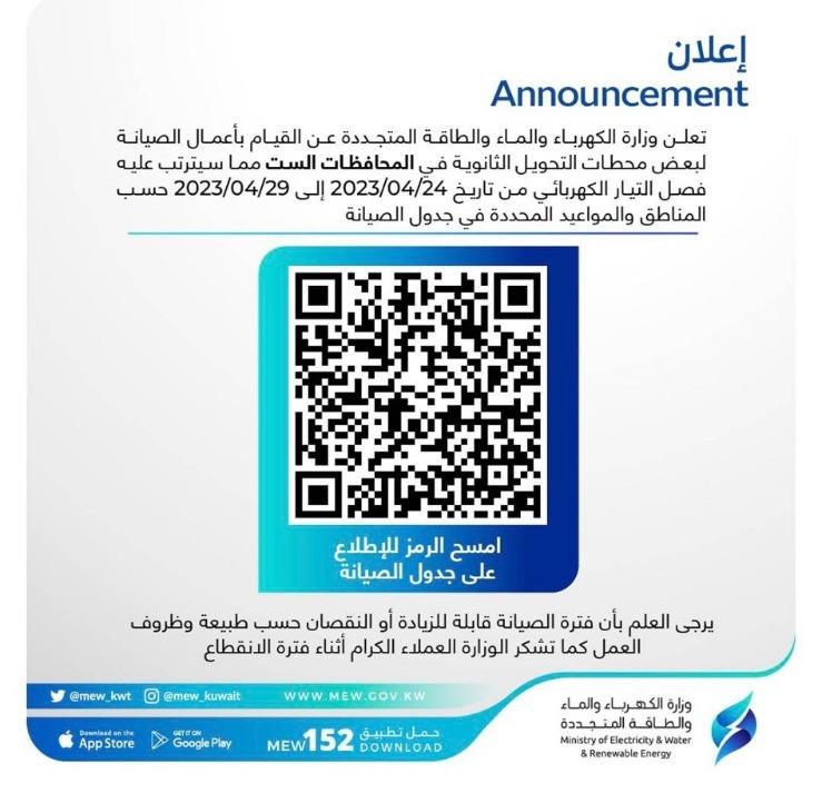 أعلنت وزارة الكهرباء والماء «عبر حسابها بتويتر» عن قيامها بأعمال صيانة لبعض محطات التحويل الثانوية في المحافظات الست مما سيترتب عليه فصل التيار الكهربائي بدءاً من اليوم الإثنين الموافق 24 أبريل حتى السبت 29 أبريل الجاري، حسب المناطق والمواعيد المحددة في جدول الصيانة.