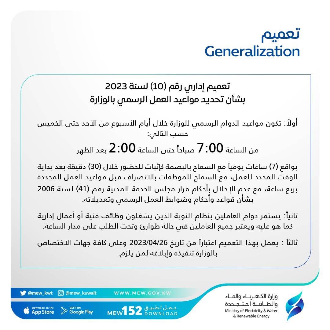 وجاء في التعميم: أولا: تكون مواعيد الدوام الرسمي للوزارة خلال أيام الأسبوع من الأحد حتى الخميس حسب التالي: من الساعة 7:00 صباحا حتى الساعة 2:00 بعد الظهر بواقع (7) ساعات يوميآ مع السماح بالبصمة كإثبات للحضور خلال (30) دقيقة بعد بداية الوقت المحدد للعمل، مع السماح للموظفات بالانصراف قبل مواعيد العمل المحددة بربع ساعة، مع عدم الإخلال بأحكام قرار مجلس الخدمة المدنية رقم (41) لسنة 2006 بشأن قواعد وأحكام وضوابط العمل الرسمي وتعديلاته.