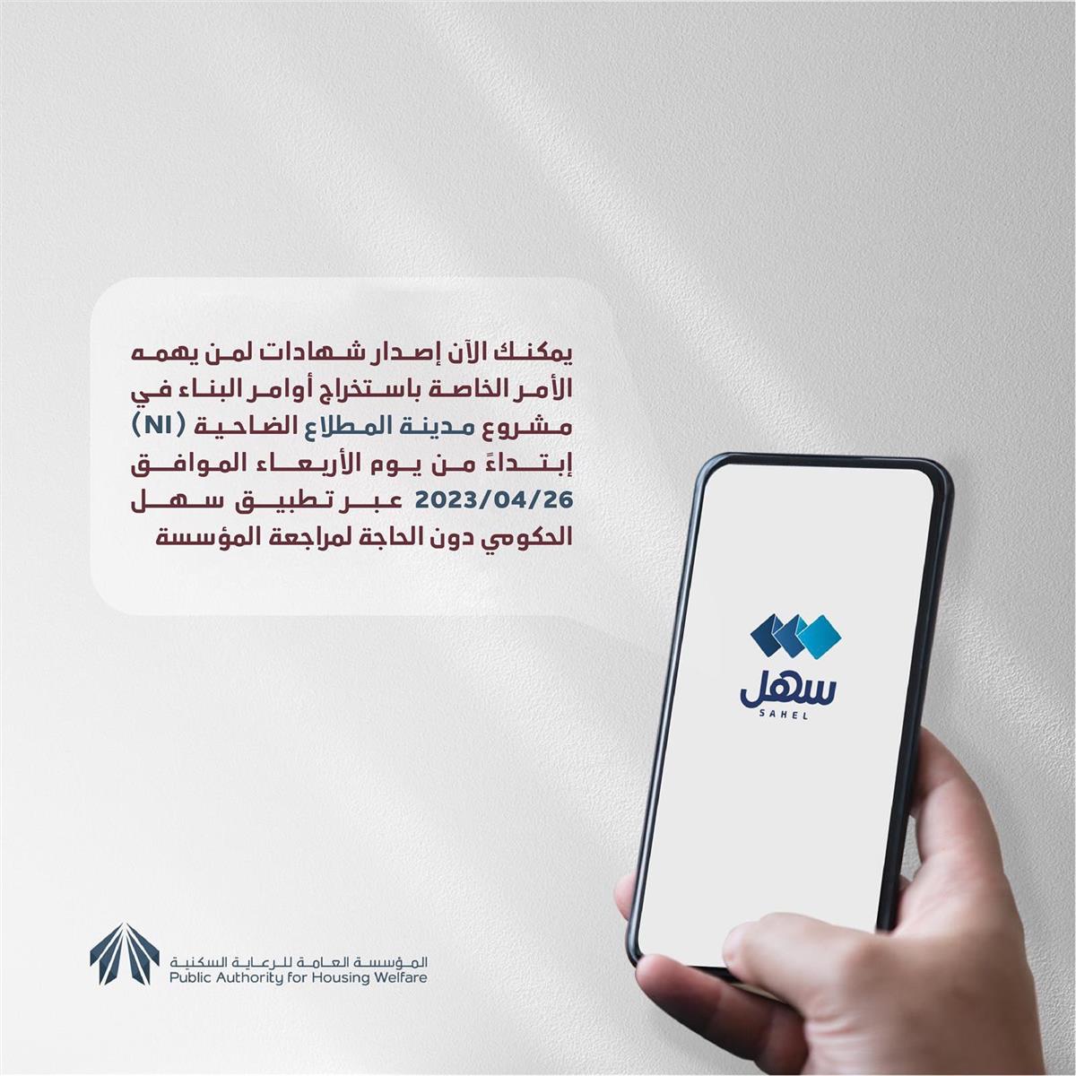 أعلنت المؤسسة العامة للرعاية السكنية أنه يمكن الآن إصدار شهادات لمن يهمه الأمر الخاصة باستخراج أوامر البناء في مشروع مدينة المطلاع الضاحية «N1» إبتداءً من يوم الأربعاء الموافق 26 أبريل 2023 عبر تطبيق «سهل» الحكومي دون الحاجة لمراجعة المؤسسة.