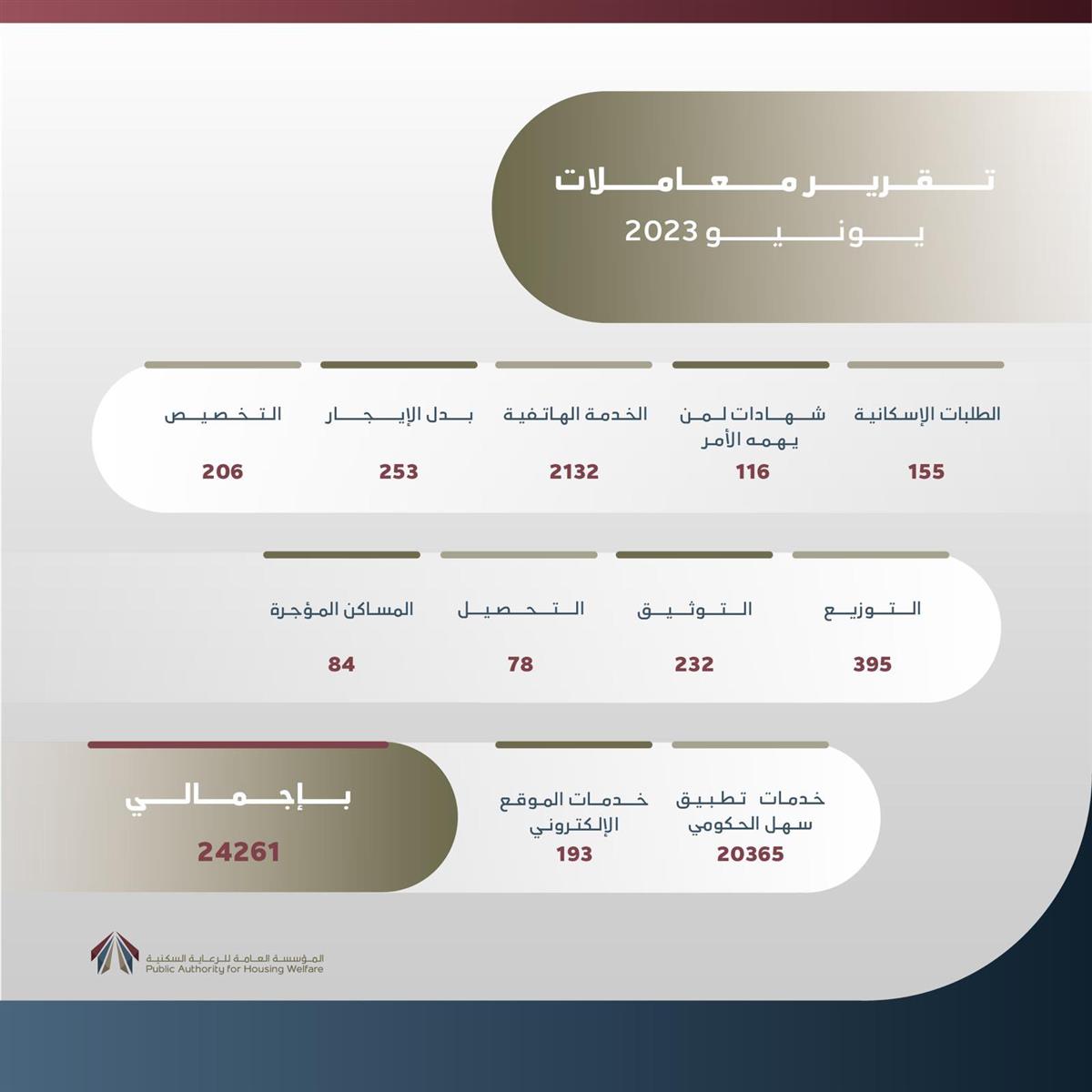 انجزت المؤسسة العامة للرعاية السكنية ممثلةً بإدارة خدمة المواطن 24,261 معاملة خلال شهر يونيو الماضي منها 155 إجراء يخص الطلبات الإسكانية إضافةً إلى 206 إجراء يخص التخصيص و 253 إجراء يخص بدل الايجار.