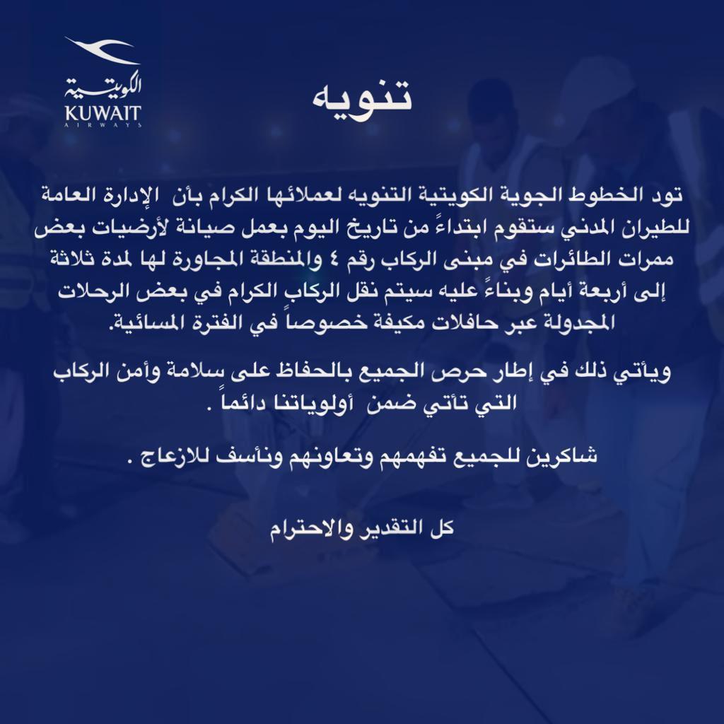 نوهت الخطوط الجوية الكويتية بأن الإدارة العامة للطيران المدني ستقوم ابتداءً من تاريخ اليوم بعمل صيانة لأرضيات بعض ممرات الطائرات في مبنى الركاب رقم 4 والمنطقة المجاورة لها لمدة ثلاثة إلى أربعة أيام وبناءً عليه سيتم نقل الركاب الكرام في بعض الرحلات المجدولة عبر حافلات مكيفة خصوصا في الفترة المسائية.