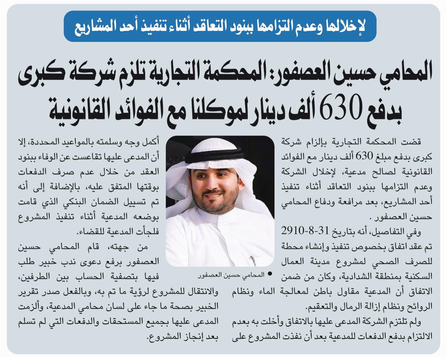 المحامي حسين العصفور: المحكمة التجارية تلزم شركة كبرى بدفع 630 ألف دينار لموكلنا مع الفوائد القانونية