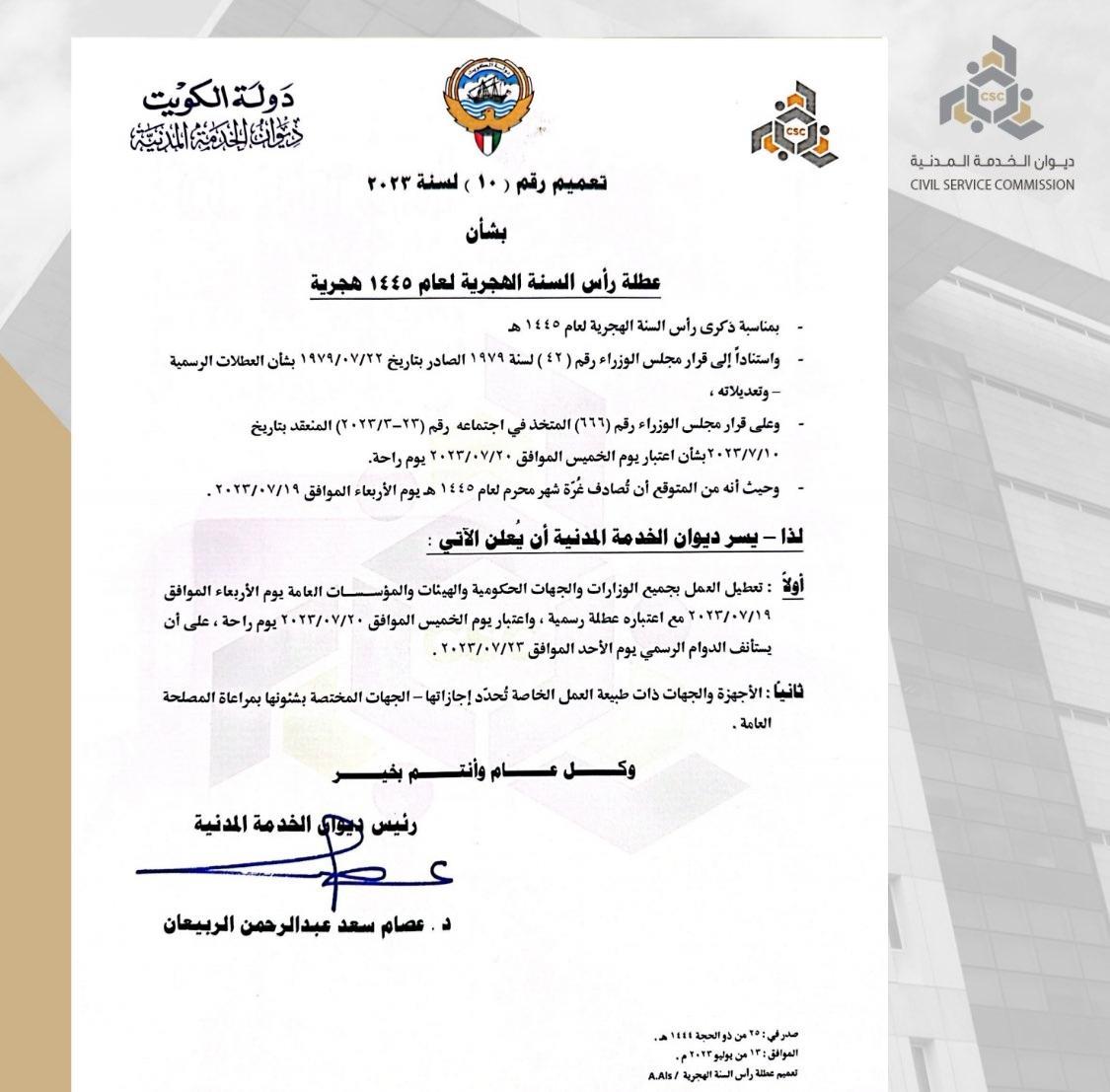 أعلن ديوان الخدمة المدنية عن تعطيل العمل بجميع الوزارات والجهات الحكومية والهيئات والمؤسسات العامة يوم الأربعاء 19 يوليو مع اعتباره عطلة رسمية بمناسبة رأس السنة الهجرية، واعتبار يوم الخميس يوم راحة، على أن يستأنف الدوام الأحد 23 يوليو.